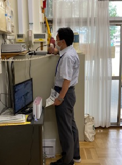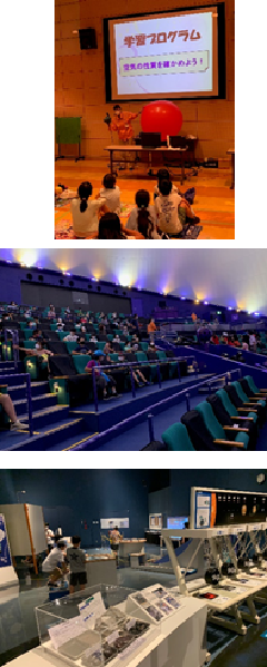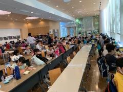 熱中症予防のため、昼食は科学館内で食べました。学校と同じように、ソーシャルデイスタンスを保ちながら、向かい合わせではなく、同じ方向を向いて食事しました。