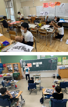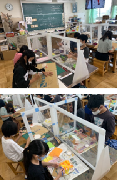 5年生の図工「版画」の授業です。1学期は、各教室で授業をしていましたが、図工室に感染予防対策の「仕切り」を設置し、図工室での授業を再開しました。この「仕切り」は、図工科の阿部先生と6年生の有志の児童による手作りです。