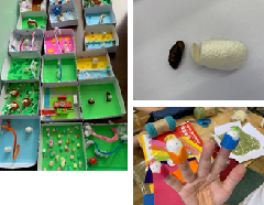 3年生は、カイコの「マユ」を使って人形を作り、子供たち一人一人の独創的な「カイコ・ザ・ワールド」を完成させていました。マユをはさみで切って、さなぎを取り出すときは少し驚いていましたが、友達と工夫したところを教え合いながら、意欲的に作品作りに取り組んでいました。