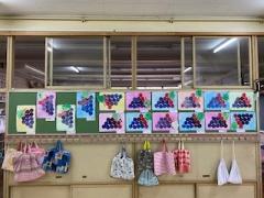 1年生の廊下には、絵具の混ぜ方の学習で描いた作品が掲示されています。題名は「ぶどうのえ」です。絵具の赤に青を少しずつ混ぜていきました。むらさき