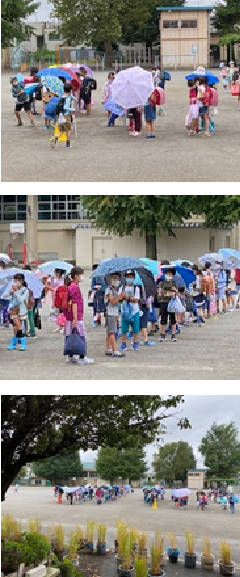 今朝はあいにくの雨模様です。台風が近付いてきており、朝から降ったりやんだりを繰り返しています。元気な子供たちは、3日間のお休みを経ての登校ですが、友達の顔を見つけると、嬉しそうに手を振ったり、アイコンタクトを取ったりして、笑顔を交わす様子が見られました。