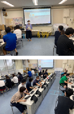 放課後、今日のプログラミング学習の授業を踏まえて、先生方が研修を行いました。発達段階に応じた教材や、より効果的な学習方法などを学び合いました。
