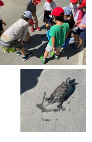 立ち替わりカメを一目見ようと集まってきていました。担任の先生が、「カメはね、ずっと甲羅がお水につかっていると病気になっちゃうかもしれないからね、時々甲羅干しをした方がいいよね。」と子供たちに優しく説明をしていました。カメの甲羅干しには、皮膚を乾燥させる役目もあります。また栄養素の吸収をするためにも甲羅干しは必要なのです。