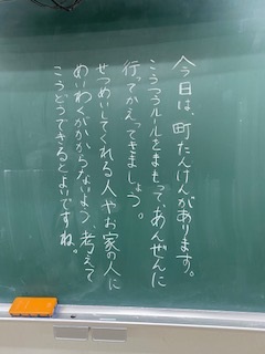 今日は、待ちに待った「町たんけん」です。1学期から計画を立て、準備を進めてきました。コロナ対策や熱中症予防、交通安全に留意して「さあ! 出発です!」