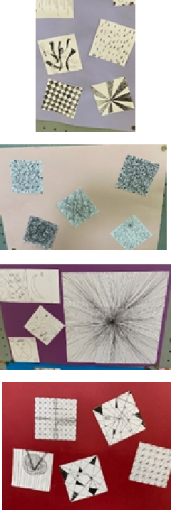 5年生が図工の時間に作品作りをしました。題名は「心のままに線でぐるぐる」です。一枚の小さな画用紙を渡して、子供たちには、「失敗にはならないから模様を工夫して描く」と伝え学習をスタートさせました。落書きから発想を深めさせ、模様にしていく楽しさを味わう作品作りを行いました。濃い紫の台紙の作品は、始めは1枚からスタートし、最後は9枚で1つの作品となりました。子供たちの発想力は留まるところを知らず、どの作品も力作です!!