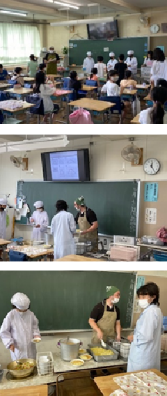 今日のメインは、カレードリア風クリームライスです。ご飯をよそい、シーフードの入ったカレークリームをかけます。熱いごはんと熱いクリームをお皿によそいますが、低学年は先生が手伝っています。高学年の先生も、全員エプロンと帽子や三角巾、マスク姿で子供たちの楽しい給食時間を見守ります。子供たちに段取りを伝え、先生もしっかりと給食指導を行っています。