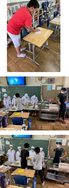 給食の時間です。12時15分より給食時間が始まります。子供たちは、新しい生活様式に則った給食の時間を過ごすことが、上手にできるようになりました。まずは、自分の家から持ってきた布巾で机の上を丁寧に拭きます。給食当番さんも、しっかりと丁寧に時間をかけて手を洗い、素早く支度ができるようになりました。