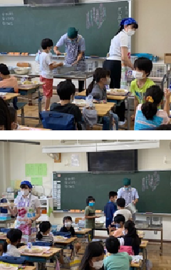 給食の時間が多くの子供たちの食べる楽しみの時間となっています。今は、新しい生活様式に則り、前向き給食となっていますが、その状態にも子供たちは随分慣れました。美味しい給食を友だちとおしゃべりをしながら食べられる日を待ち遠しい気持ちで過ごしています。学校では、子供たちに十分に食べる時間を確保したいことから、12時15分から用意をはじめ、12時30分には、おおよそのクラスが「いただきます」をする予定となっています。12j時55分には「ごちそうさま」をして片付けを行いますので、賞味20分間でしっかりと食べます。しっかりと好き嫌いなく食べて、元気な心と体を作ってほしいです。