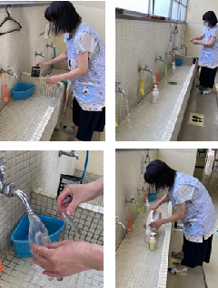 保健室の先生たちは、建物すべての水道の蛇口をひねり、お水を出しています。水質検査を行い、安全に飲めるお水かどうかの確認も済みました。皆さんが手を洗うときに使う石けんも、きちんと網に入っているかどうか、汚いものはないかどうかを確認して取替をしています。液体せっけんも、ボトルに満量を入れて確認が終わりました。皆さんが登校してきたときの手洗いの準備が整いました。