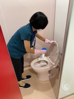 スクールサポートスタッフの方々にも、トイレの消毒を丁寧にしていただき完了しました。すべての便器を消毒し、ドアのノブやドアの消毒も行いました。便器のフタも消毒済みです。トイレットペーパーの補充もできました。