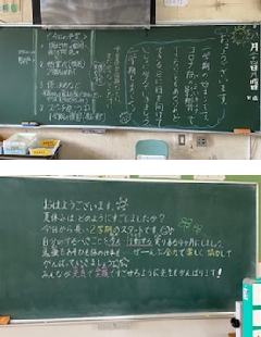 いよいよ2学期がスタートしました。今朝、教室を巡回した際に、それぞれの教室に温かい言葉が書かれていました。先生たちが子供たちに向けて、「元気ですごせましたか」「暑いけど頑張りましょう」「みんなが笑顔で元気ですごせるように先生も頑張るよ!」など、先生たちも全力で2学期をスタートさせました。いくつかのクラスの黒板を掲載します。