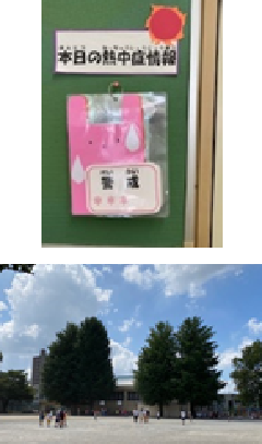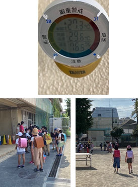 今朝も、東京都では熱中症警戒アラートが発表されていました。田無小学校の職員室前に下げている指数計は、午前8時30分の段階でWBGT(暑さ指数)が27.3℃を示していました。子供たちが登校してきたときにも今日は校庭の木陰や昇降口前など、日の当たらない場所を選んで並びました。