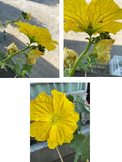算数ルームの外に目を向けると、1学期の終わりにはなかったものが見えます。ヘチマの花が咲いています。よーく見ると、この雄花から雌花にアリが花粉を運ぶ様子が見られました。ヘチマの受粉にアリも一役かっています。