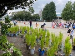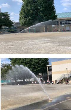 今朝、スプリンクラーを作動して、校庭に水をまきました。砂埃が舞うのを抑えるとともに、涼を感じることができました。わかば学級の子供たちも、元気に「朝のマラソン」をしていました。