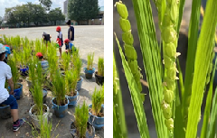 5年生が大切に育てている稲が開花しました。稲は、一年の中で一番暑いときに、開花・受粉すると言われています。稲は自分の花粉で受粉する自家受粉の植物です。同じ穂の中で、開花・受粉が成立します。今朝も、5年生がしっかりとお世話をしたり、観察をしたりしていました。稲の花が咲いたことも嬉しそうに話してくれました。