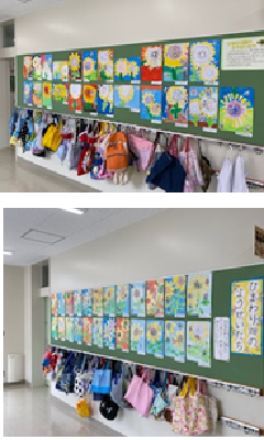 2年生が図工の時間にヒマワリを描きました。タイトルは「ひまわり畑のようせいたち」です。説明文には「クレヨンをつかって、夏におなじみのひまわりをえがきました。ひまわりの花びらは、クレヨンをよこにたおして、こすりつけるようにしてぬりました。ひまわりには、オリジナルのようせいたちがあそびにきています。」とあります。のびのびとクレヨンを使い、素敵な作品が完成しました。
