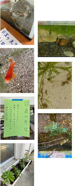 1年生、3年生、5年生、6年生の教室にいる生き物や植物です。みんな元気ですよ。教室前には、日直の先生へ、お願いのお手紙を吊るしています。しっかりご飯も食べさせています。安心してください。