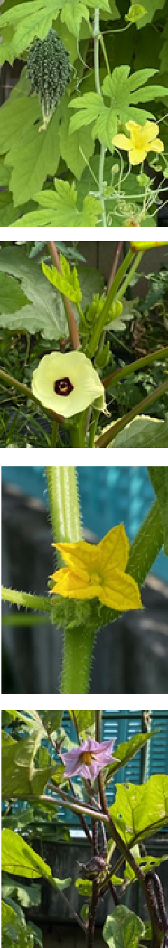 答えは、ゴーヤ、オクラ、キュウリ、ナスです。夏のお日様をしっかりと浴びて、植物もしっかりと育っています。
