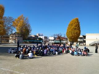 今日から師走。中休みのことです。見事な晴天の中で、子どもたちは元気いっぱい校庭で遊んでいます。プープープー 避難訓練のサイレンが鳴りました。すると、子どもたちは一斉に遊ぶのをやめて、校庭の真ん中に集まり始めました。その後は、次の指示があるまで静かに座って待っていました。担任の先生がいなくても、自分たちで避難行動をとることができる子どもたち。立派です。