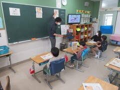 3時間目は1年2組の授業を見ました。国語の学習でした。教科書の挿絵を大きくして、2枚の挿絵を並べ、比べていました。「これは同じ場所なのかな?それとも違う場所なのかな?」「同じ場所だよ」「どうして?」「なんでかというとね・・・」みんな元気いっぱいに同じ場所の理由を発表していました。後半は違っていることも確かめていました。