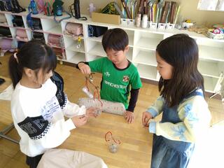 2年生の教室に行くと、図工の授業中でした。小さなキャラクターが生活できるようなお家を、段ボール箱や大きめの箱などを材料にして、夢中で作っています。『ともだちハウス』という名前のようです。どのような家にするのか考えたり、飾りつけやデザインを工夫したりして、とにかく楽しそうに取り組んでいます。耐震強度や建築基準法などの常識はさておき、子どもたちの考える『ともだちハウス』は、面白いアイデアがいっぱいのユニークな作品ばかりでした。