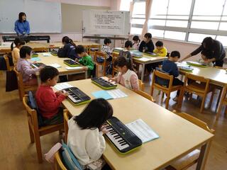 音楽の授業の様子です。わかば学級の低学年の子どもたちが、楽器のキーボードを使って『きらきらぼし』を練習しています。鍵盤ハーモニカと同じように、キーボードは鍵盤を使って演奏します。しかし、ボタン操作で音色を様々な楽器の音に切り替えられる点は、キーボードの強みです。授業の終わりに、子どもたちはキラキラした音色を選んで『きらきらぼし』を演奏していました。まさに曲名の通り、夜空に輝く星空を彷彿とさせるような、素敵な演奏となりました。