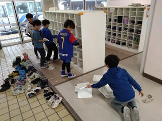 廊下を歩いていると、昇降口から声が聞こえてきました。その場所に行くと、3年生の子どもたちが靴箱を掃除していました。よく見ると、全員分の棚板を外して、ひとつひとつきれいに拭き掃除をしています。どうやらこのクラスは、大掃除の時間だったようです。いつもはできない細かいところまで、今日はみんなで力を合わせて、時間をかけて清掃や環境美化に努めていました。担任の先生がいない場所の掃除でも、手を抜くことなく働いている子どもたちの姿に感心しました。
