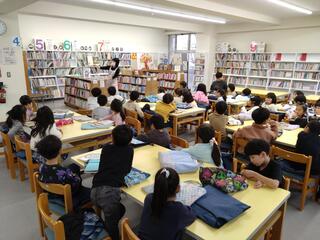 図書室では、1年生が読み聞かせの最中でした。サンタクロースについて書かれた本のようです。