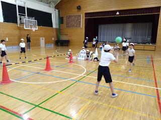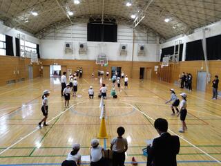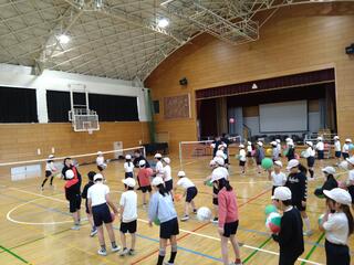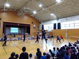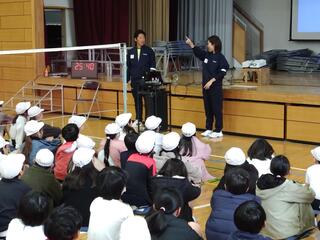 授業の中で一番盛り上がったのは、実際に選手たちとバレーボールを体験した場面です。子どもたちは実に楽しそうな表情で練習に励んでいました。