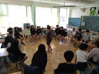 今日は、デフビーチバレーボール日本代表の選手や監督、通訳の方々にお越しいただき、4年生の子どもたちとわかば学級の子どもたちに向けて、特別授業をしていただきました。4年生の子どもたちは、総合的な学習の時間の中で「共に生きる」というテーマで学習を展開し、様々な障害についての理解を深めてきました。わかば学級の子どもたちは、年間を通して「デフリンピック」について学び続け、実際にアスリートと交流したり、東京で開催された大会の観戦にも行ったりしてきました。そのため、今日の授業を心待ちにしていた子どもたちはとても多かったです。