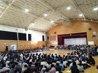 静寂に包まれた体育館。子どもたちが等間隔に座っています。