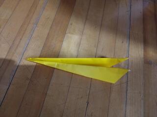 先週、3学期の学校イベント「天下一飛行機王決定戦」の決勝戦が行われました。(先週は「校長のつぶやき」に書く内容が多かったため、この件について紹介することが遅くなってしまいました…。)各学年の代表の6名が、体育館のステージに並んでいます。手に持っているのは、それぞれの予選や準決勝を勝ち抜いてきた「紙ひこうき」です。ここで、各学年の代表機となった「紙ひこうき」を紹介します。