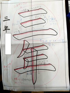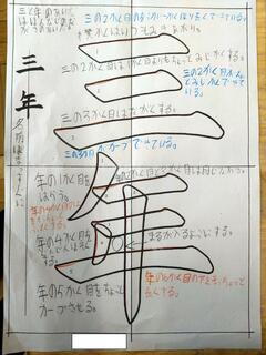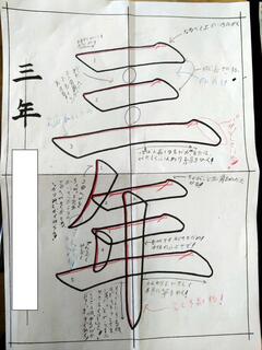一人ひとりの「お手本」に、筆の入れ方や注意すべきポイント等がいくつも書き込まれています。書かれている内容は、子どもたちによってバラバラで、全員異なっています。これは子どもたちが自分で注意すべきポイントを考えて、「お手本」の紙に直接書き込んでいるようです。作品一枚にかける意気込みや、一筆にかける思いが伝わってきます。たいしたものです。