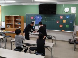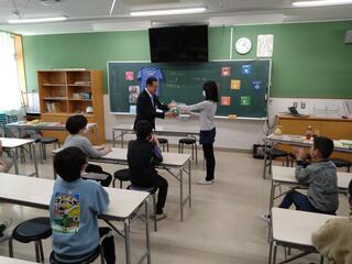 教室では、わかば学級の代表児童が今までの活動を池澤市長に紹介し、集まった「2345円」を直接市長に手渡しさせていただくことができました。すると、池澤市長も、わかば学級の子どもたちに表彰状を贈ってくださいました。そして、サプライズとして、かわいい「いこいーな」の人形もプレゼントしてくださいました。思いがけない贈り物に、子どもたちは大喜びでした。