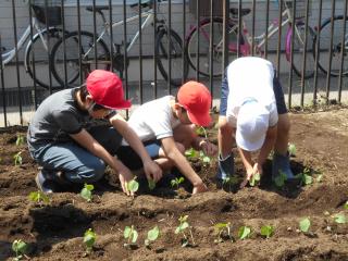 5月11日(金曜日)、総合の「大豆パワーのひみつ」の学習で、畑に大豆の苗を植えました。西東京市の農家の保谷さんと古川さんをゲストティーチャーに迎え、雑草抜きをし、畑の畝の作り方、苗を植えるときのポイントなども聞きました。