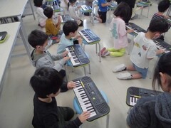 音楽の授業では、季節の歌を聴いたり歌ったり、リズムの学習をしています。5月は、歌は「こいのぼり」「茶つみ」の鑑賞と歌唱をしています。リズムの学習では、カスタネットやミニキーボードを使って学習しています。音楽講師のスタートとストップの合図に合わせたり、「うん・たん」のリズムに合わせて音を鳴らしたりして、楽器に親しむ活動をしています。