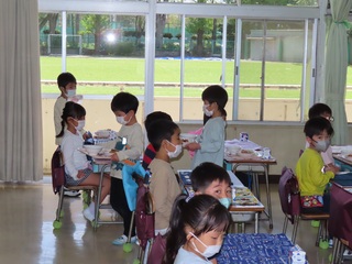 新1年生が本日、初めての給食をいただきました。メニューはホットドック、クリームスープ、サラダでした。給食当番は、白衣に着替え、準備万端。栄養士の先生から作法を教えていただき、いざ、実践。他の子は、お盆の上に配膳されたスープやおかずをこぼしたり、落としたりしないように、そろりそろりと慎重に運びました。みんなで揃っていただきますをしました。