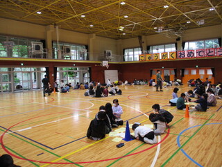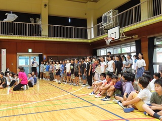 2日目はあいにくの空模様で、朝の集いは体育館で行いました。しっかりと眠ることができたので、どの子も元気そうな顔つきでした。