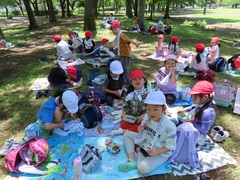 1年生の遠足は武蔵野中央公園へ行きました。学校からみんなで歩いていきました。前日は大雨で心配しましたが、当日は、素晴らしい晴天で、思いきり遊ぶことができました。まずは広場の大きな木の周りに荷物を置き、クラスごとに遊びました。おのごっこや花いちもんめ、オオバコずもう、だるまさんが転んだ、中あてなど本当に楽しみました。みどり学級のお友達は、遊具を使って遊びました。お昼もゆっくりと時間をとり、お弁当を味わいました。お昼寝をするグループもありました。しばらく個人遊びをした後、全員で遊びました。子供たちの体力は底なしでした。
