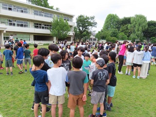 今回の集会は、全校で大人気の「猛獣狩りへ行こうよ」集会です。司会者が動物の名前をいい、必要な仲間を集め、グループを作る遊びです。例えば、「ゴリラ」なら3文字なので、3人組を作るといった具合です。最初のうちは、同じ学年のお友達とグループを作りますが、だんだん進むと兄弟学年でグループを作る等の条件が付き、ぐっと難易度が上がります。最後はたくさんの学年のお友達とグループを組み、楽しんでいました。