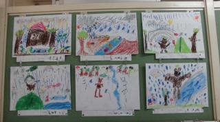 1年生「あめふりくまのこ」の歌を聞いて、うかんだ情景を絵に表しました。