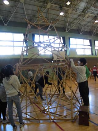 6年生が180センチメートルと90センチメートルの角材と太い輪ゴムを使った造形活動をしました。名付けて「谷戸小カーペンターズ」。12図工の時間に各班で知恵を出し合って割りばしと輪ゴムで試作をしたものをもとにつくりました。当日は東京田無ライオンズクラブの方々の指導のもと、どの班も協力して力いっぱい活動を楽しみました。展覧会の会場にどっしりそびえる6年生ならではの造形です。今月17金曜日)18土曜日)の展覧会には是非ご来場いただきご覧いただければと思います。
