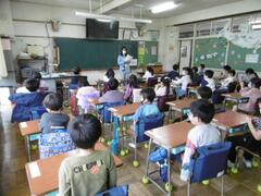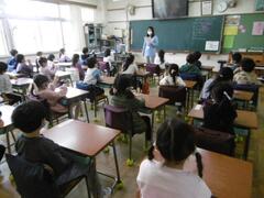 6年生がお手本になっていることは勿論のこと、1年生の隣の4年生が座り方や話の聞き方のよき手本となり、1年生も落ち着いて話を聞くことができました。ありがとう4年生!!