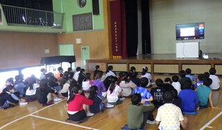 本校は、代表児童のほか、6年生全員が体育館に集まって、一緒に説明とお話を聞きました。まさに「自分事」としてとらえるです。