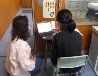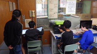 さて、帰校してから、お昼の放送をしている放送室にお邪魔しました。当番の放送委員、給食委員の皆さんがいます。