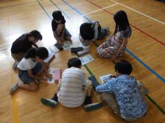 ここでは自分の夏休みを漢字・数字・色等の一文字に表し、互いの夏を報告し合っています。
