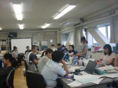 夏休みを利用して、私たち教員は様々な研修会に参加します。そこで学んできたものを自分の職務に生かすだけでなく、学校全体に還元するのも大切な役割です。左は安全教育についての研修会に参加した教員が講師となっての伝達講習会、右は生活指導主任によるいじめ防止研修会の様子です。