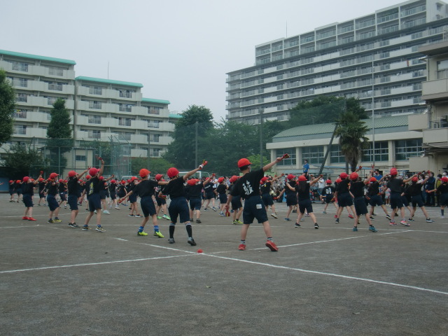 1年生は校庭で体育発表会に向けて運動していました。