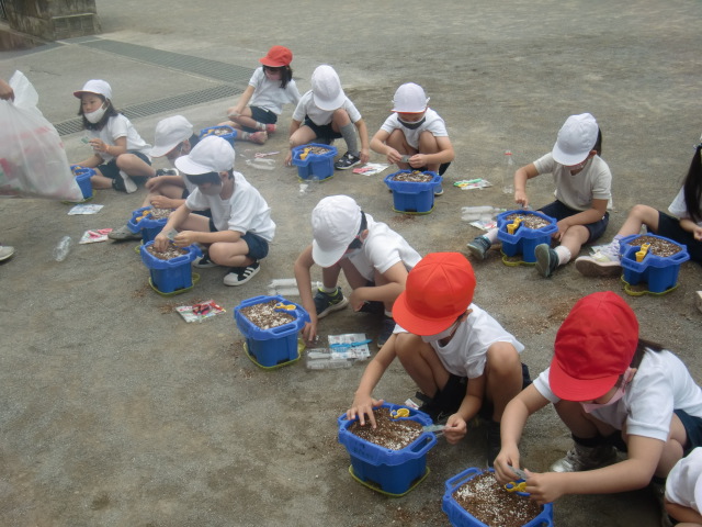 校庭では1年生が植木鉢を持ってなにかしています。