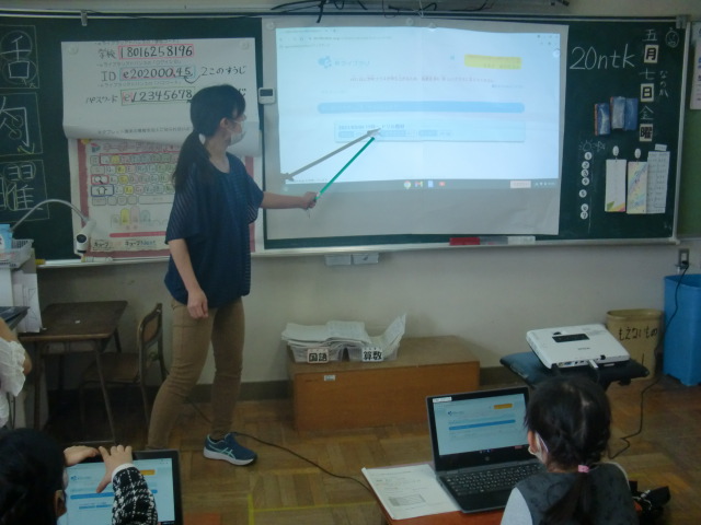 5年生の教室では、タブレットを使って学習していました。